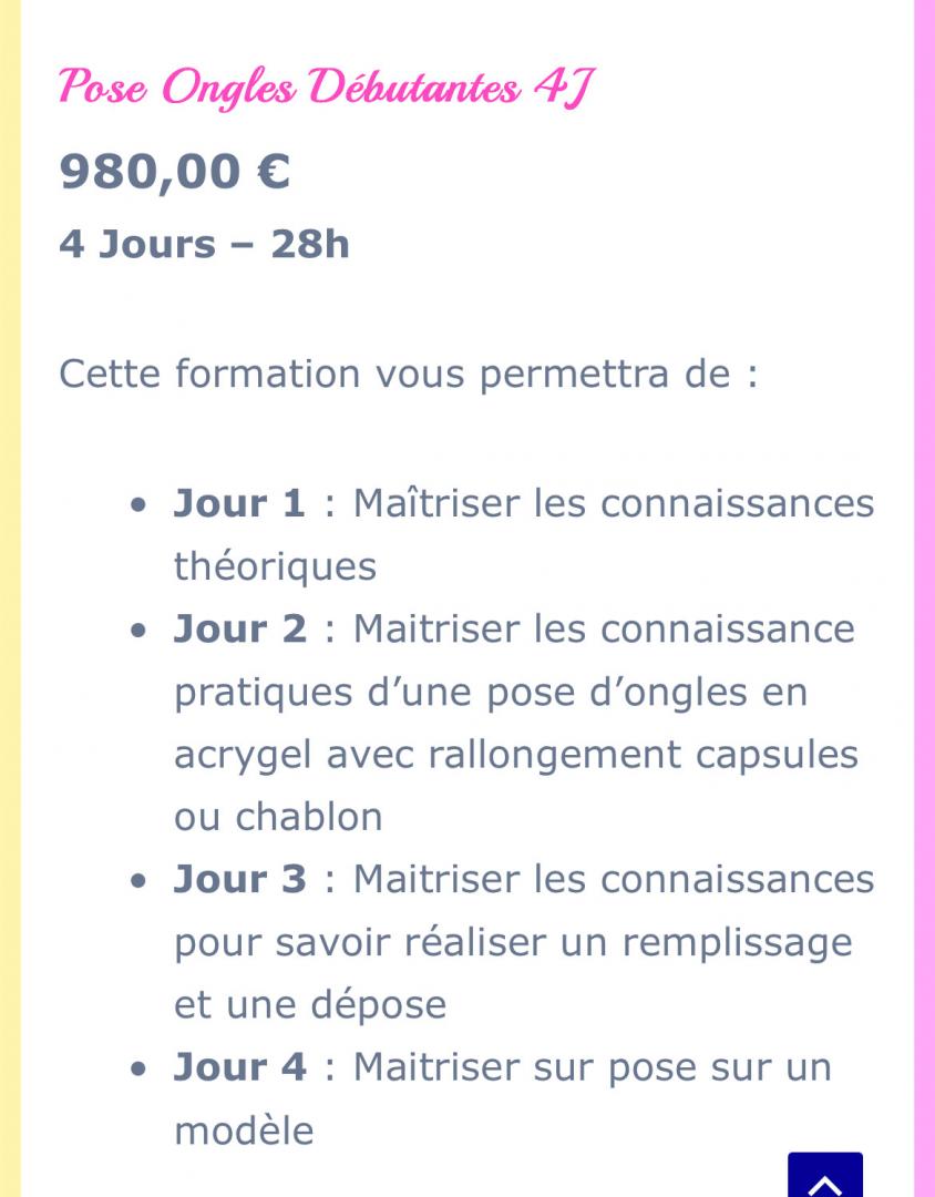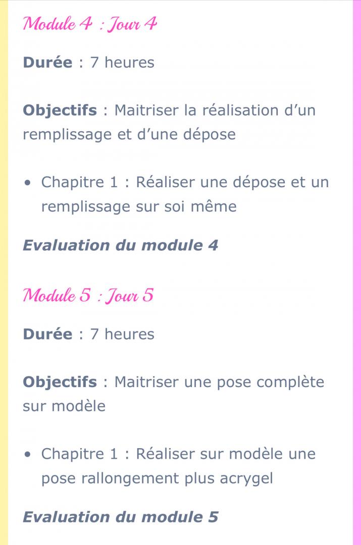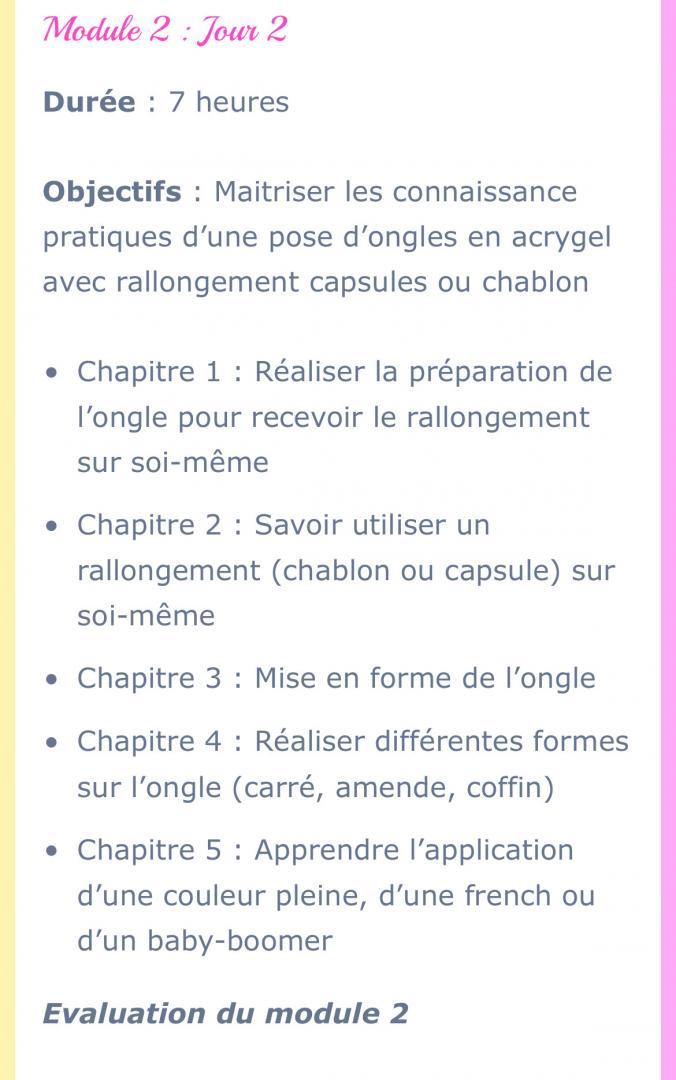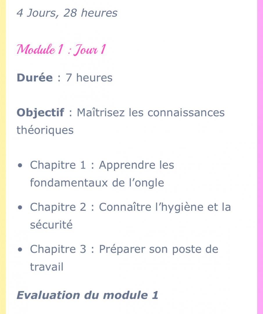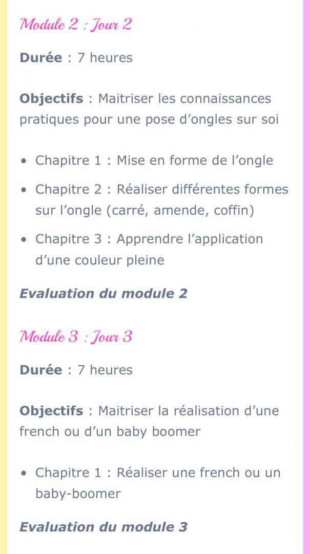 Je suis formatrice en esthétique du regard et en prothésie ongulaire depuis plusieurs années et je suis passionnée par mon métier. J’ai à cœur de transmettre mes connaissances et mon savoir-faire à mes élèves afin qu’ils puissent eux aussi exceller dans ce domaine.